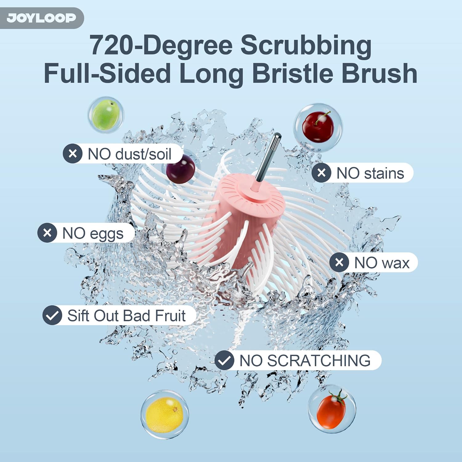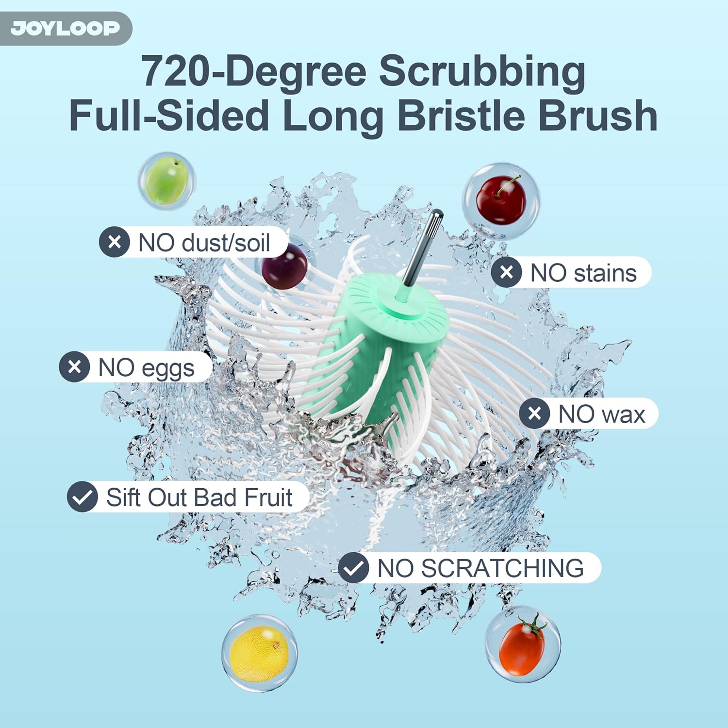 720° Deep Clean: Soft TPE tabs + full‑sided bristle brushes remove dust, wax, pesticides and residues—gentle on fruit skin