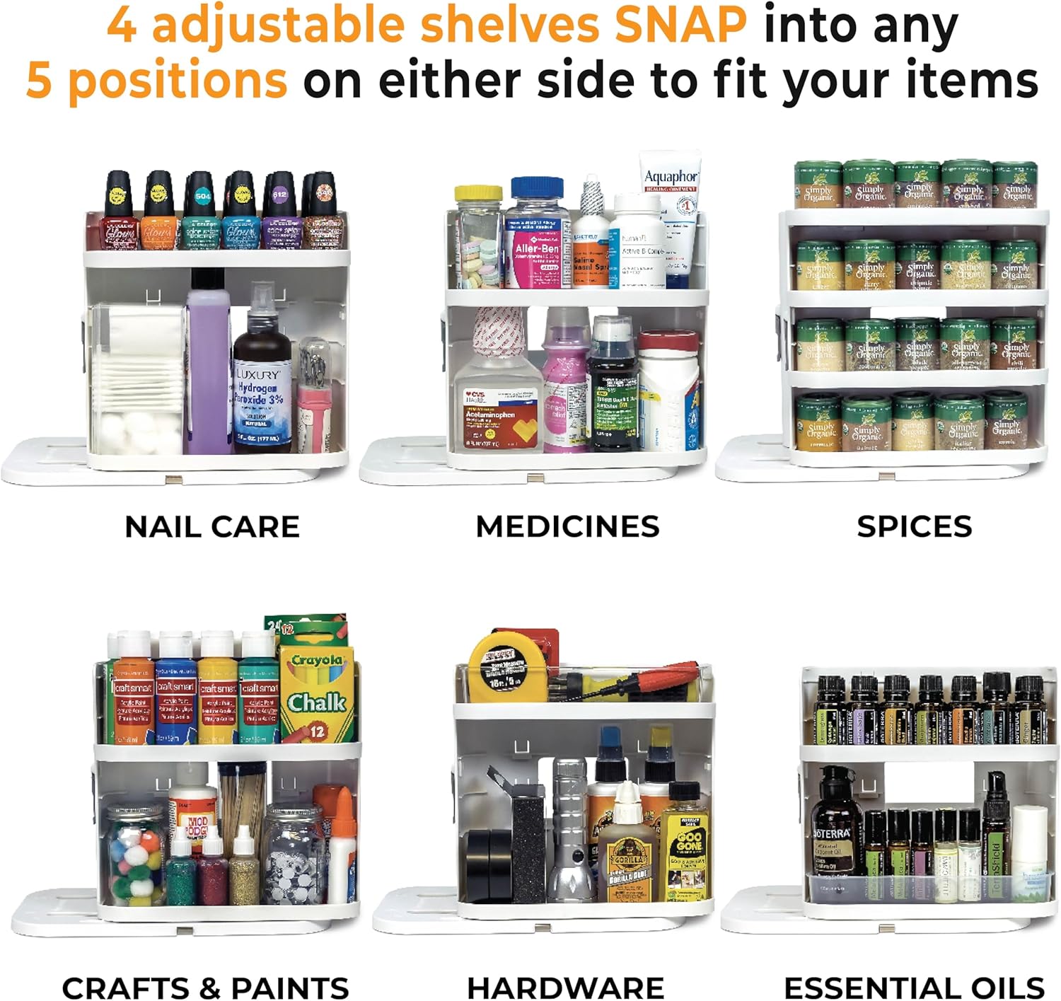 Customizable Shelves: Snap in adjustable shelves with 5 height options on each pod—8.5″ W × 2.75″ D—to perfectly fit spice jars and seasoning containers.